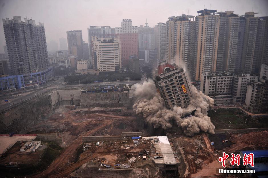 1月14日,屹立于重庆市沙坪坝商圈十多年、20层高的怡馨大厦被成功爆破拆除。随着怡馨大厦爆破拆除,沙坪坝商圈扩容提质工程也随之启动。未来,沙坪坝商圈将扩容5倍。图为怡馨大厦爆破现场。 陈超 摄