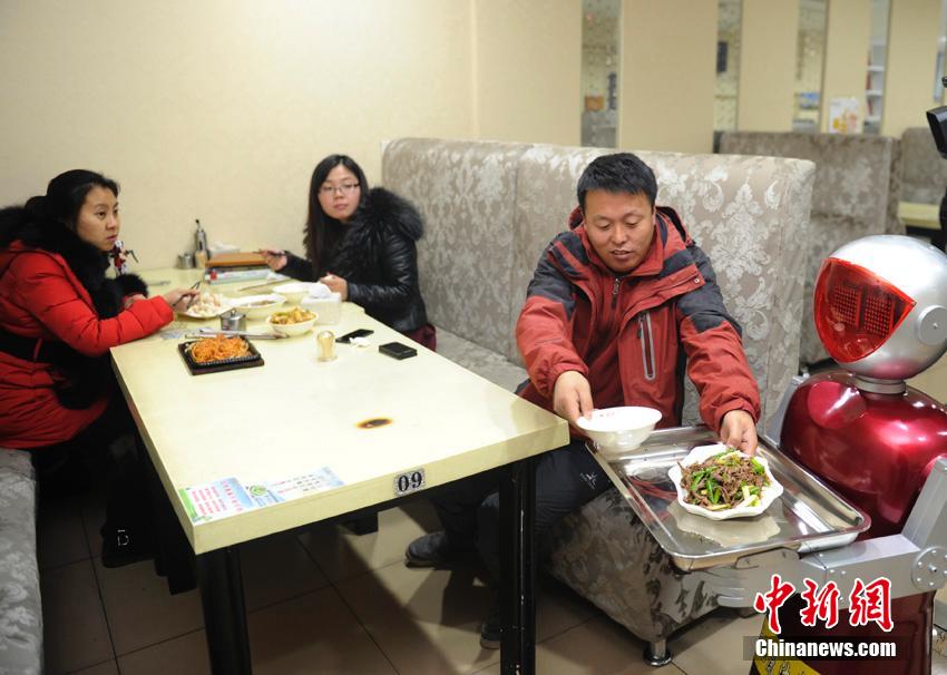 1月14日,长春市一家饭店内,两位机器人服务员正在有序地为食客传送菜品。这家饭店的女店主是一位“85后”,几天前以16万元人民币的价格购置了这两位机器人服务员。店主介绍,机器人服务员每天可以从9点工作到晚上22点,可以端菜、取餐盘,两三天才充一次电,不需要专人看管,既新颖又实用。张瑶 摄