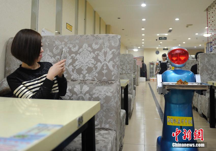 1月14日,长春市一家饭店内,两位机器人服务员正在有序地为食客传送菜品。这家饭店的女店主是一位“85后”,几天前以16万元人民币的价格购置了这两位机器人服务员。店主介绍,机器人服务员每天可以从9点工作到晚上22点,可以端菜、取餐盘,两三天才充一次电,不需要专人看管,既新颖又实用。张瑶 摄