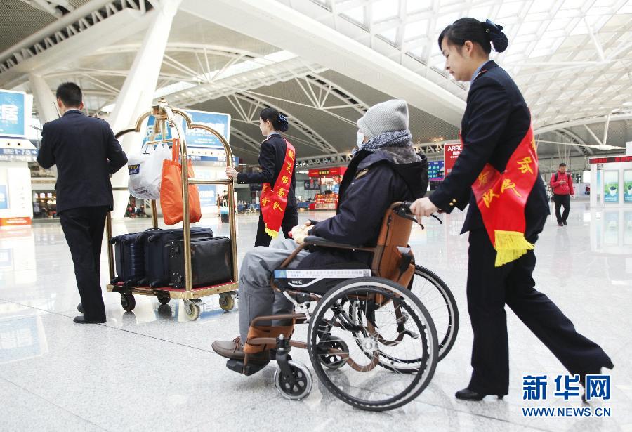1月15日,在广州南站,车站工作人员用轮椅推着大病初愈的旅客提前进站乘车。为落实铁路总公司对特殊重点旅客服务的要求,广铁集团管内广州站、广州东站、广州南站、深圳站、深圳北站、长沙站(含长沙南站)、海口站等车站进一步增加便民利民措施,对持有铁路有效车票且行动不便的老人、病人和靠辅助器具才能行动的残疾旅客提供特殊重点旅客预约服务,并协调联动车站和车队实行一条龙帮扶。据统计,2014年全年,广铁集团共为特殊重点旅客服务396人次。新华社记者 王申 摄