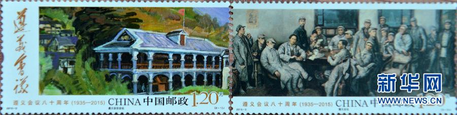 1月15日在贵州省遵义市余庆县邮政局拍摄的《遵义会议八十周年》纪念邮票。当日,中国邮政发行《遵义会议八十周年》纪念邮票1套2枚,图案内容分别为:遵义会议会址、遵义会议。全套邮票面值为2.40元。新华社发(贺春雨 摄)