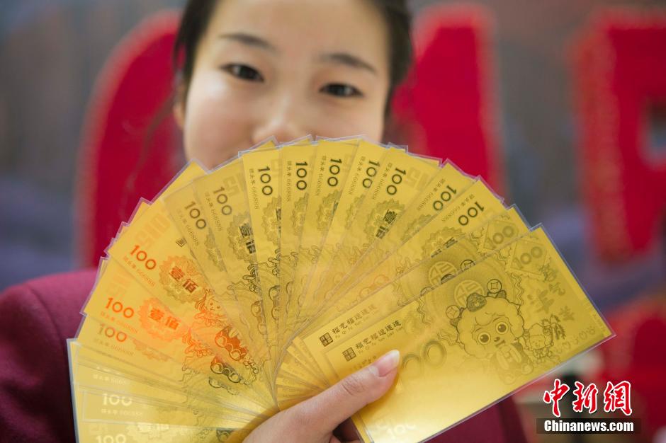 每逢新年,各种贺岁金钞遍纷纷登场,五花八门让人眼花缭乱。1月15日,山西太原某银行一工作人员展示由黄金打造的各种羊年贺岁金银钞。 中新社发 张云 摄