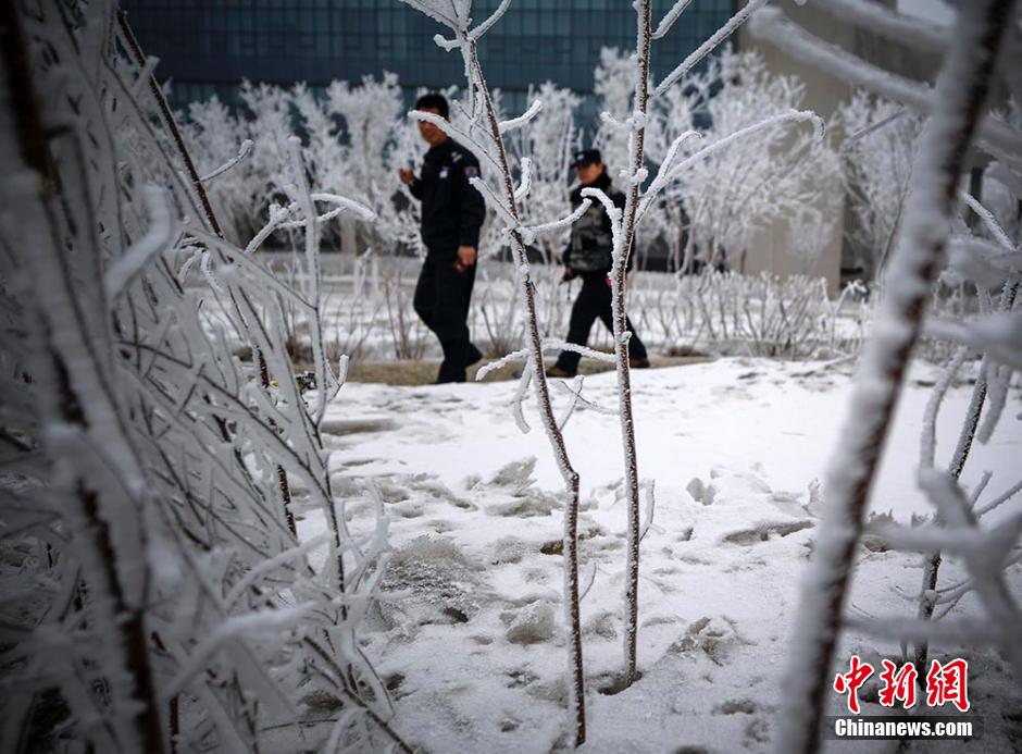 1月15日,持续浓雾之后,乌鲁木齐的雾气依然没有散去,但街道两旁光秃秃的树木却挂上了毛茸茸的冰晶,将整个城市装扮的晶莹剔透,分外妖娆。刘新 摄