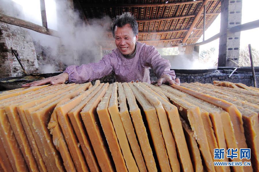 1月15日,广西隆林各族自治县革步乡平安村一名村民在码放糖片。春节临近,广西百色市隆林各族自治县的壮族群众开始忙着用传统土法制作红糖片,供应节日市场。生产出来的红糖片除满足本地需求外,主要销往云南、贵州等地。新华社发(林斌 摄)