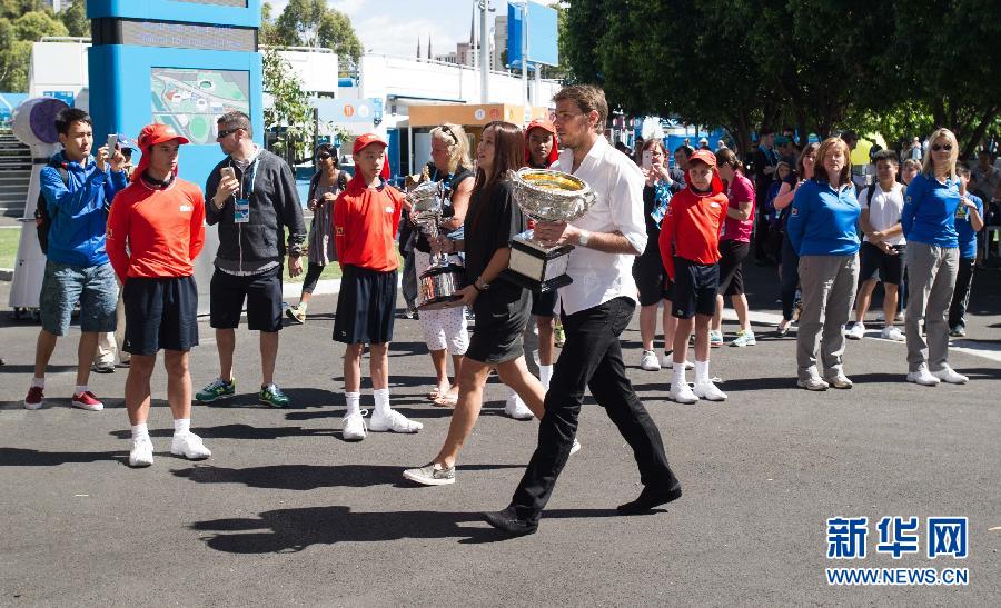1月16日,李娜(前左)和瓦林卡手捧冠军奖杯抵达墨尔本公园。当日,2014年澳网男女单打冠军瑞士选手瓦林卡和中国选手李娜重返墨尔本,出席2015年澳网奖杯展示活动。 新华社发(白雪摄)
