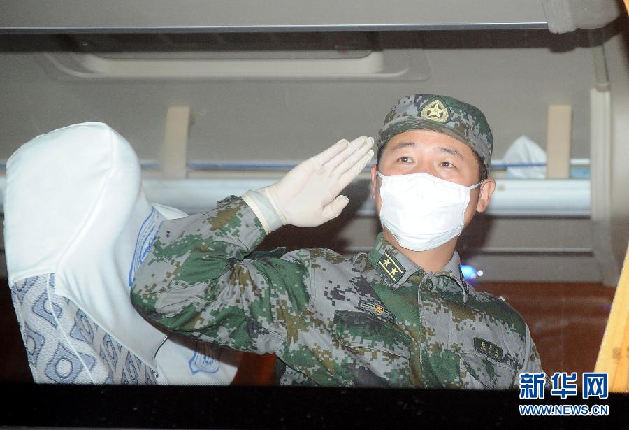 1月16日,中国援非抗埃医疗队队员在车窗后向前来迎接的人敬礼致意。当日凌晨5时许,中国援助利比里亚抗击埃博拉医疗队首批第一组82名队员凯旋抵达重庆。根据统一安排,为便于与第二批援利医疗队轮换交接,首批援利医疗队164人分两批包机回国。据了解,首批援利医疗队第一组队员回国后,将进行为期21天的医学观察,其余队员将在完成与第二批援利医疗队工作交接后于22日回国。新华社记者 唐奕摄