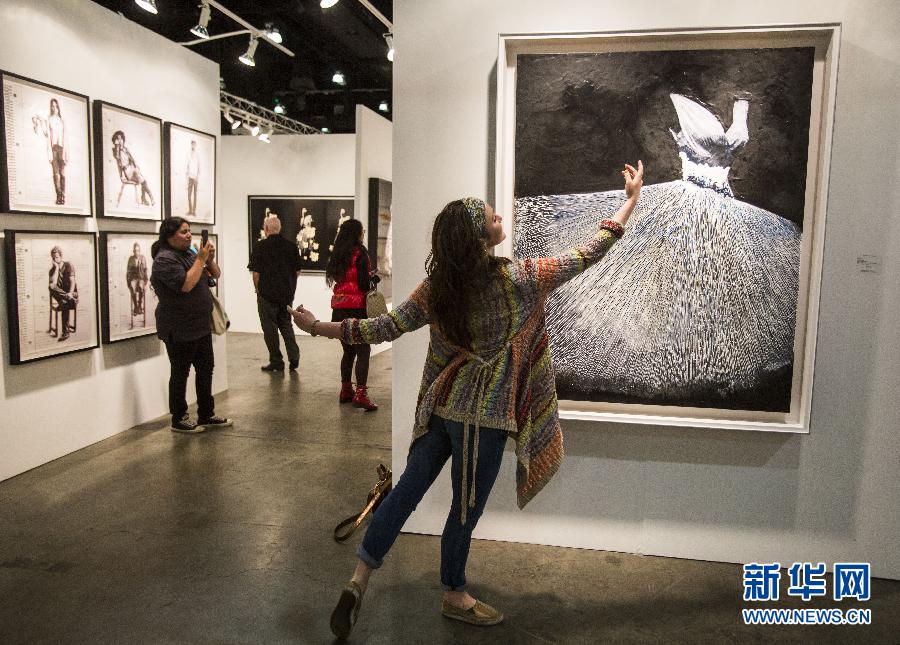 1月15日,在美国洛杉矶,一名女观众在参展作品前跳舞。当日,第20届洛杉矶艺术博览会在洛杉矶会展中心面向公众开放,展出包括来自中国的200多件艺术品。博览会将持续至18日。新华社发(赵汉荣摄)