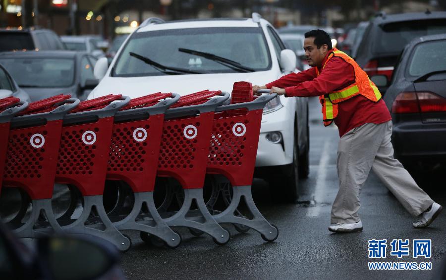 1月15日,在加拿大温哥华地区的里士满市,塔吉特百货员工收拾购物车。美国大型零售商塔吉特当日宣布,由于亏损严重塔吉特将撤出加拿大市场,关闭全部133家商店,受影响员工将达17600人。新华社发(梁森摄)