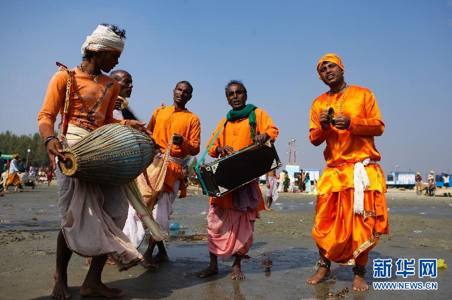 1月15日,在印度西孟加拉邦萨格尔岛,印度教信徒在海边载歌载舞。位于印度西孟加拉邦恒河三角洲、加尔各答以南约100公里的萨格尔岛是印度教的著名朝圣中心。每年1月14至15日,会有数十万印度教徒来到这里的海边沐浴、拜谒寺庙。新华社记者郑焕松摄
