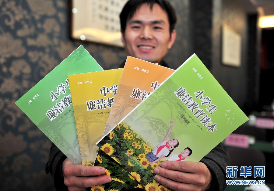 1月16日,校方代表在展示《中小学生廉洁教育读本》一套4册书籍。当日,由安徽省纪委(安徽省监察厅)以及多单位联合编写的《中小学生廉洁教育读本》举行向校园赠书活动。《中小学生廉洁教育读本》全书有小学低年级、高年级、初中、高中共4册,书籍运用中外名言、经典人物和故事,以深入浅出的形式呈献给中小学生,旨在让中小学生从小树立廉洁奉公的理念。新华社记者 郭晨摄