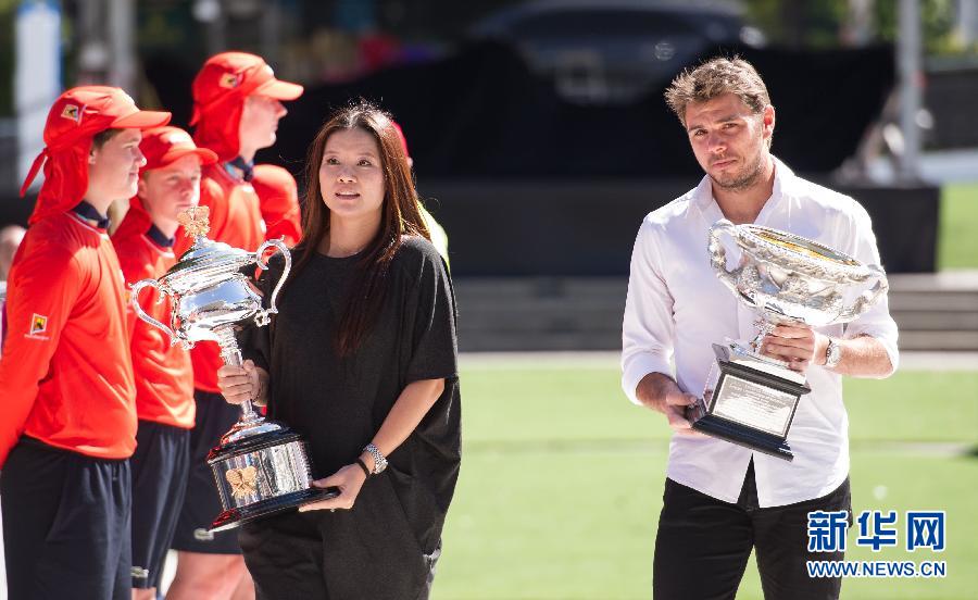 1月16日,李娜(左)和瓦林卡手捧冠军奖杯抵达墨尔本公园。当日,2014年澳网男女单打冠军瑞士选手瓦林卡和中国选手李娜重返墨尔本,出席2015年澳网奖杯展示活动。 新华社发(白雪摄)