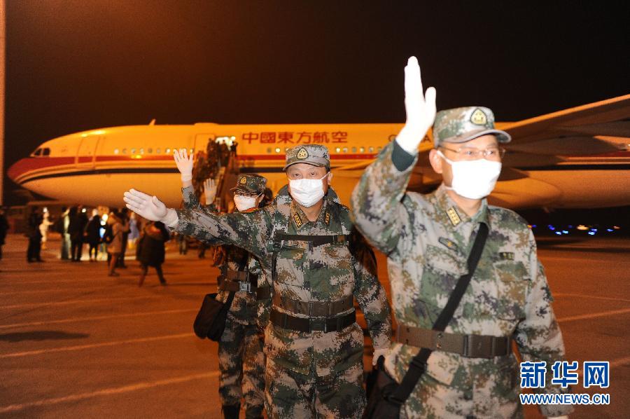 1月16日,中国援非抗埃医疗队首批回国队员向前来迎接的人挥手致意。当日凌晨5时许,中国援助利比里亚抗击埃博拉医疗队首批第一组82名队员凯旋抵达重庆。根据统一安排,为便于与第二批援利医疗队轮换交接,首批援利医疗队164人分两批包机回国。据了解,首批援利医疗队第一组队员回国后,将进行为期21天的医学观察,其余队员将在完成与第二批援利医疗队工作交接后于22日回国。新华社记者 唐奕摄