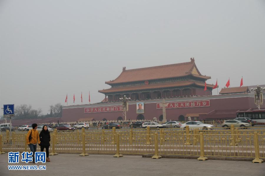 1月15日,游客在雾霾中游览天安门广场。当日,中央气象台继续发布霾黄色预警,15日白天到夜间,东北地区中部、北京中南部、天津大部、河北中南部、山西南部、河南北部、陕西关中、四川盆地等地仍有中度霾。预计1月16日起,上述地区的雾霾将自北向南减弱消散。新华社发(刘宪国 摄)