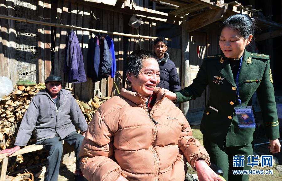 1月15日,福州罗源边防大队军医在了解“渐冻人”谢基全老师(前左)的情况。当日,福建省福州市罗源边防大队联合罗源县“随手公益”组织志愿者一起举行“奉献爱心温暖‘渐冻人’”公益慈善活动。边防官兵和志愿者带着社会各界的捐款和大米、食油、电饭煲和电暖气等过冬必备品来到地处偏僻的罗源县下尾自然村,为“渐冻人”谢基全一家进行爱心捐赠。谢基全是罗源县下尾自然村小学的一名代课老师,他和家里的两名家人都是“渐冻人”,高额的医疗费用支出和病魔无情的折磨,让他全家身处极大困境中。新华社记者魏培全摄