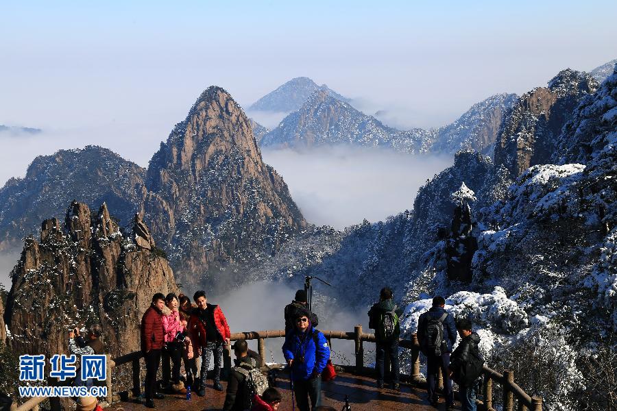 1月15日在黄山风景区拍摄的雪后壮美风景。当日,黄山风景区雪后初晴,景区内一派银装素裹,云海飘荡,分外妖娆。 新华社发(水从泽 摄)