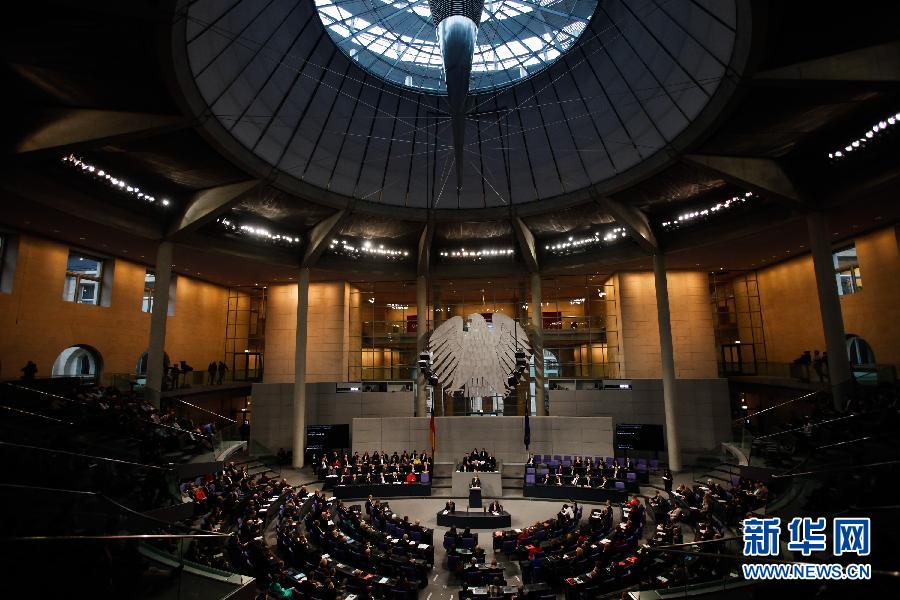 德国联邦议会当日举行特别议程,纪念法国巴黎袭击事件遇难者。德国总理默克尔在当天的议程中就近日发生在法国巴黎的恐怖袭击事件与国家安全等议题发表政府声明。 新华社记者张帆摄