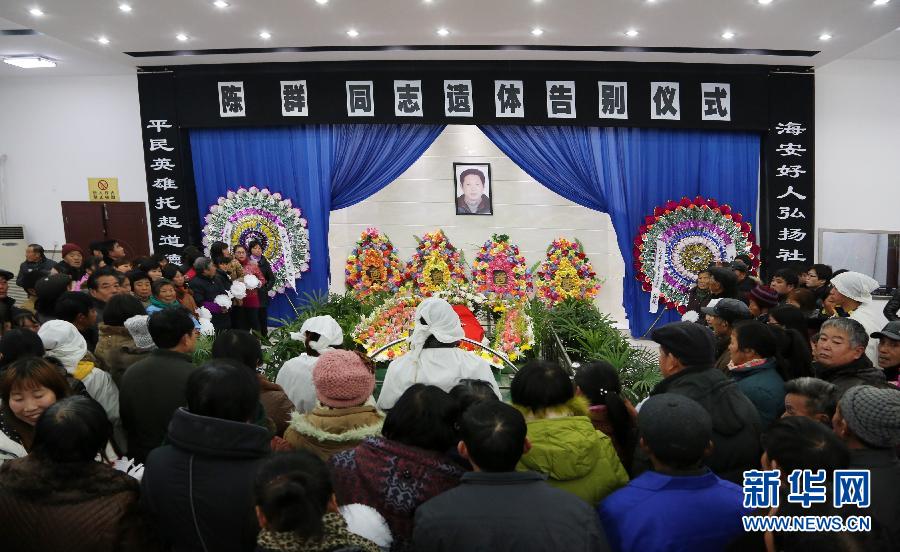 1月15日,亲人和群众在遗体告别仪式上为陈群送行。当日,因救人而牺牲、被网友称为“托举大叔”的陈群遗体告别仪式在江苏省海安县殡仪馆举行。1月10日,为救一名74岁的落水老人,海安县滨海新区富港村五组52岁村民陈群跃入冰冷的河水里,经过15分钟的托举,老人得救了,而陈群却因体力不支沉入河中,不幸牺牲。新华社发(景圣红 摄)