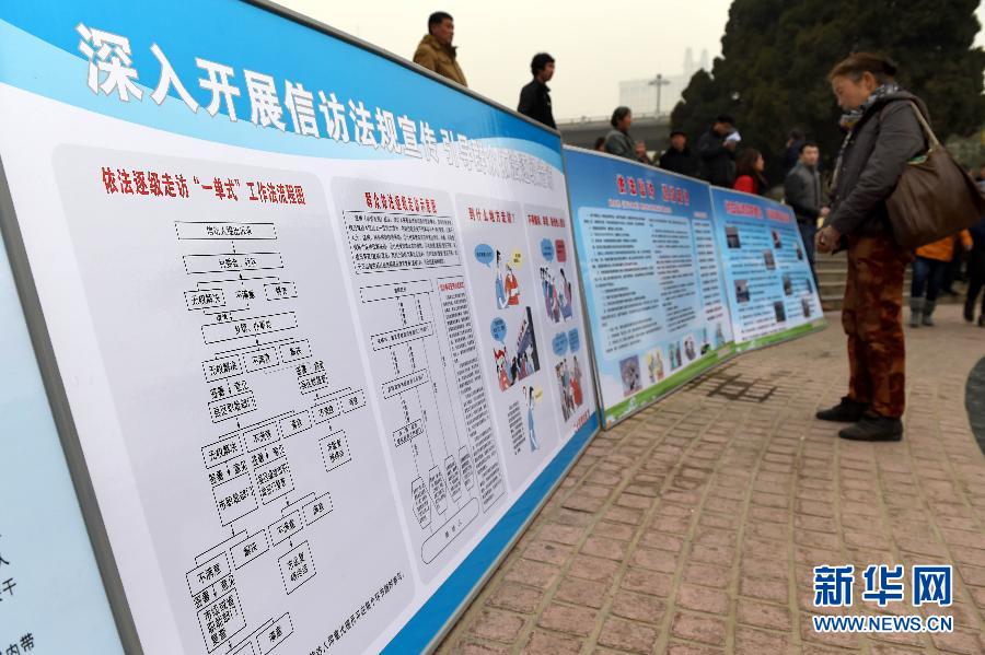 1月15日,市民在活动现场观看宣传展板。当日,由河南省信访局主办的依法逐级走访集中宣传活动在郑州市紫荆山公园举行,河南省信访局、郑州市信访局的工作人员围绕依法逐级走访工作,开展咨询服务、画板展览、发放宣传资料等形式的宣传活动,让市民了解依法逐级走访的工作流程,引导群众依法逐级有序反映问题。新华社记者李博摄