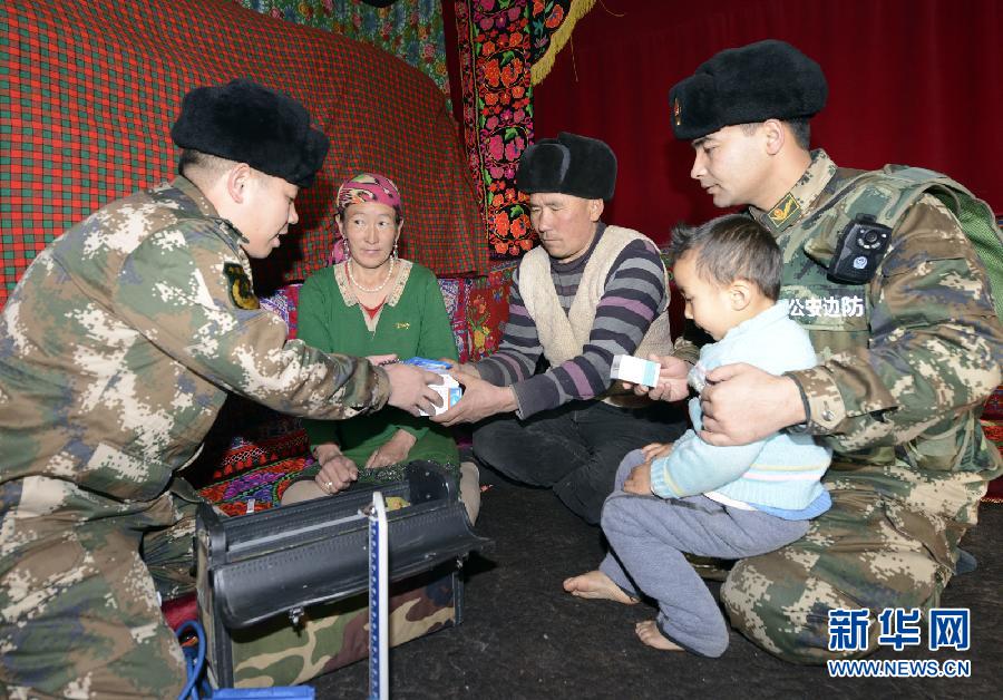 1月15日,边防官兵为阿勒克木村牧民发放免费药品。当日,新疆克孜勒苏柯尔克孜自治州边防支队恰提铁列克边防派出所军医与当地医疗专家组成“义诊小分队”,深入交通不便、自然条件艰苦的阿勒克木村,为当地群众提供体检服务,同时免费发放药品,讲解常见病的预防知识。新华社发(刘丈国 摄)