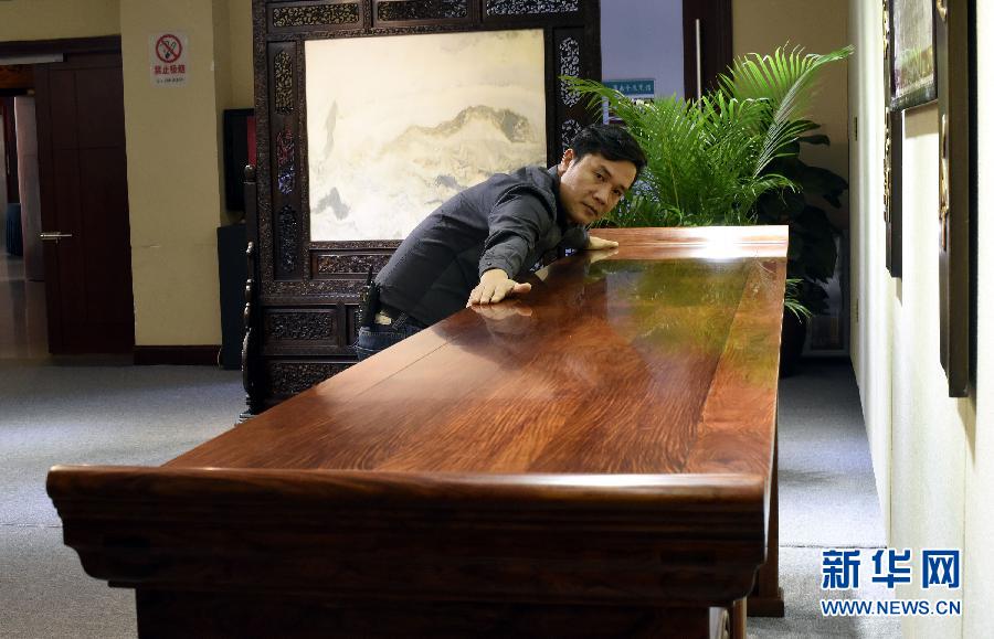 1月15日,工作人员用手臂比量案面的长度。当日,由广东江门古典家具制作大师伍炳亮打造的“海南黄花梨第一长案”在广州展出,这件长案的面芯板由3片长3.6米的海南黄花梨老料拼合而成。据伍炳亮介绍,仅是收集这些木料的过程就跨越了近30年时间。新华社记者 刘大伟 摄