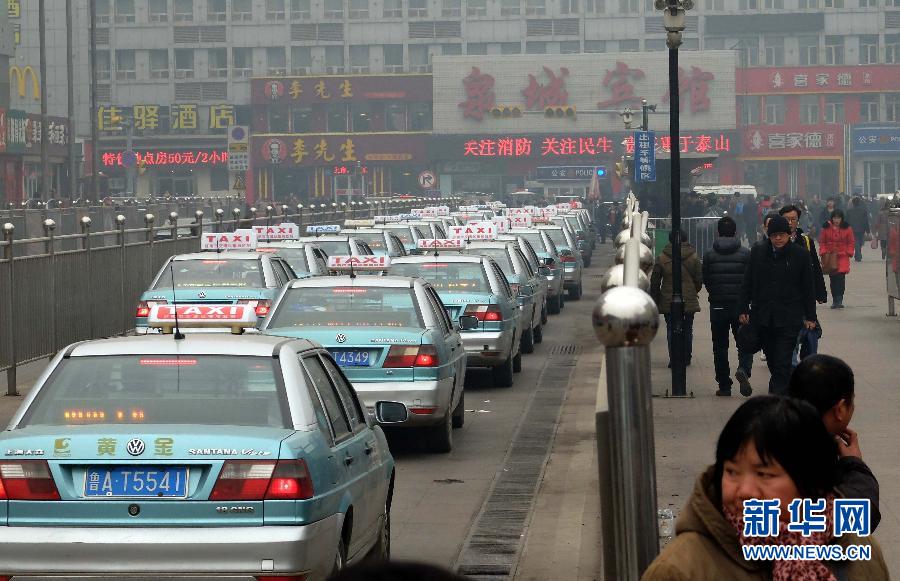 1月15日,济南市火车站广场出租车等候区有大量出租车候客。当日,济南出租车正常营运基本恢复,路面行驶出租车数量达到平日水平。1月12日,因不满“专车服务”影响生意、出租车公司“份子钱”过高等原因,济南市部分出租车出现停运,火车站等交通枢纽遭遇“一车难求”。新华社记者 徐速绘 摄