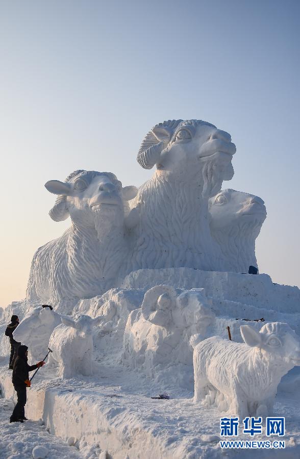 1月15日,工人在长白山池北区路边雕刻以羊为主题的雪雕。连日来,吉林省长白山市打造特色雪雕扮靓城市,为冬季旅游增加看点,为新春佳节营造气氛。 新华社记者王昊飞摄