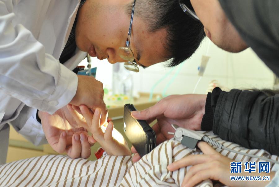 1月15日,中国人民解放军第一七四医院高医生(左)在为黄姓伤者挑去手上的玻璃碎片。