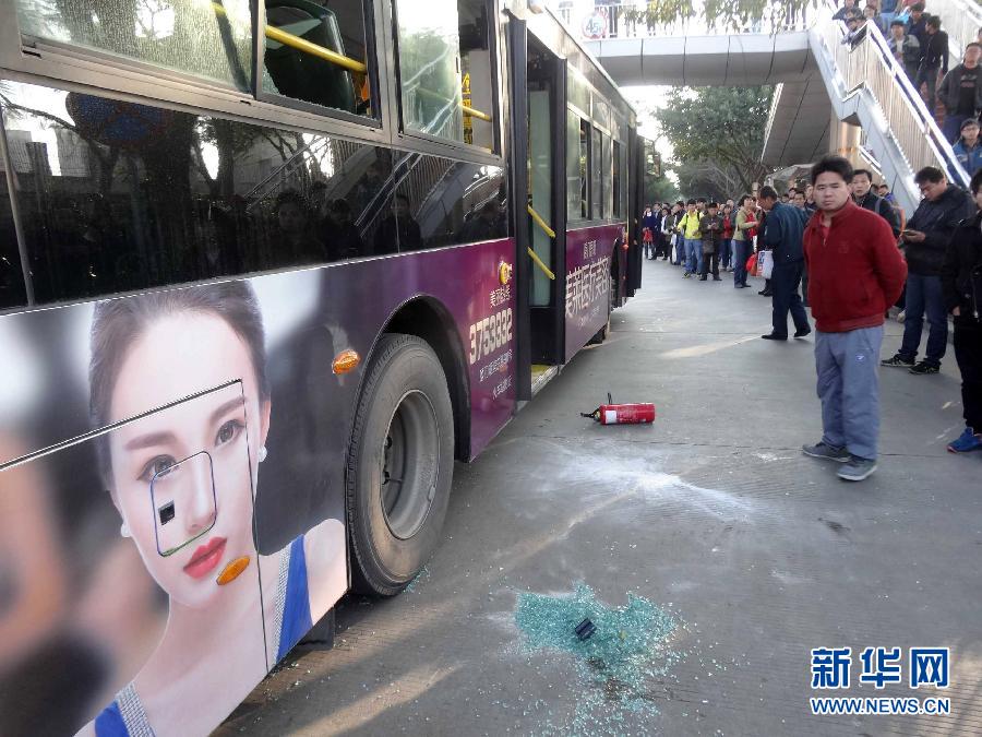 1月15日拍摄的福建厦门公交车起火现场。当日近8时,一辆车牌为闽DZ3321的656路公交车行驶至厦门吕岭路蔡塘路口时车厢中部突然起火,造成数名乘客受伤,其中1人烧伤,其余人员系车辆紧急制动时不慎撞伤。消防和派出所迅速到场,目前火已被扑灭,伤者已送医。警方在现场已控制一名犯罪嫌疑人。案件正在调查中。新华社发