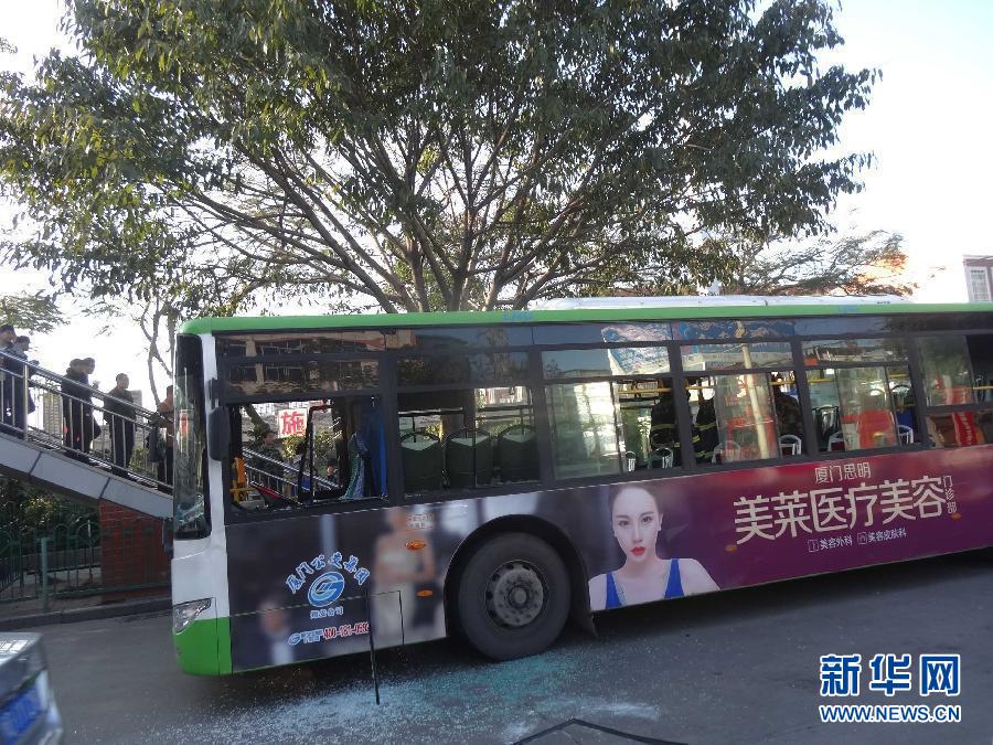 1月15日拍摄的福建厦门起火公交车。当日近8时,一辆车牌为闽DZ3321的656路公交车行驶至厦门吕岭路蔡塘路口时车厢中部突然起火,造成数名乘客受伤,其中1人烧伤,其余人员系车辆紧急制动时不慎撞伤。消防和派出所迅速到场,目前火已被扑灭,伤者已送医。警方在现场已控制一名犯罪嫌疑人。案件正在调查中。新华社发