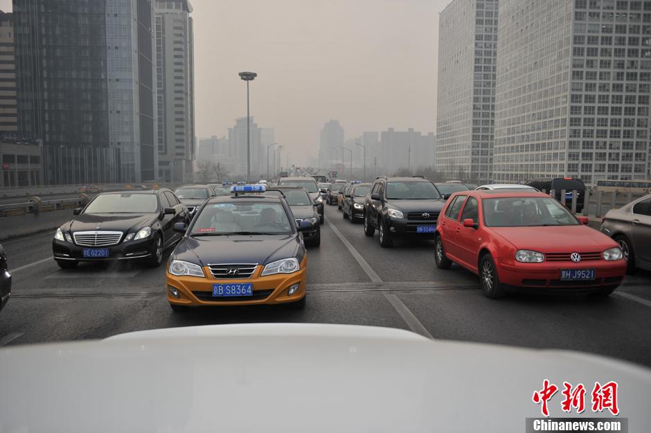2014年1月15日,北京继续沉浸在重度雾霾之中。昨天北京虽有少量降雪,但对空气中污染物的清除作用不大。今天雾和霾将持续,还有继续加重的趋势。北京市气象台15日0时25分发布大雾黄色预警信号,预计至15日上午大部地区将出现浓雾,能见度小于500米,需注意交通安全。中新网记者 金硕 摄