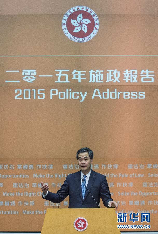 1月14日,香港特区行政长官梁振英出席记者会。当日,香港特区行政长官梁振英出席施政报告记者会。他在会上表示今年的施政报告以推进民主、发展经济及改善民生为主题,三者都受到社会关注,因此是特区政府施政的重点,但推进这三个主题的前提是法治。新华社记者 何靖嘉 摄