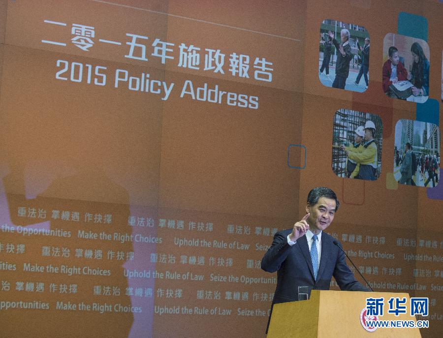 1月14日,香港特区行政长官梁振英出席记者会。当日,香港特区行政长官梁振英出席施政报告记者会。他在会上表示今年的施政报告以推进民主、发展经济及改善民生为主题,三者都受到社会关注,因此是特区政府施政的重点,但推进这三个主题的前提是法治。新华社记者 何靖嘉 摄