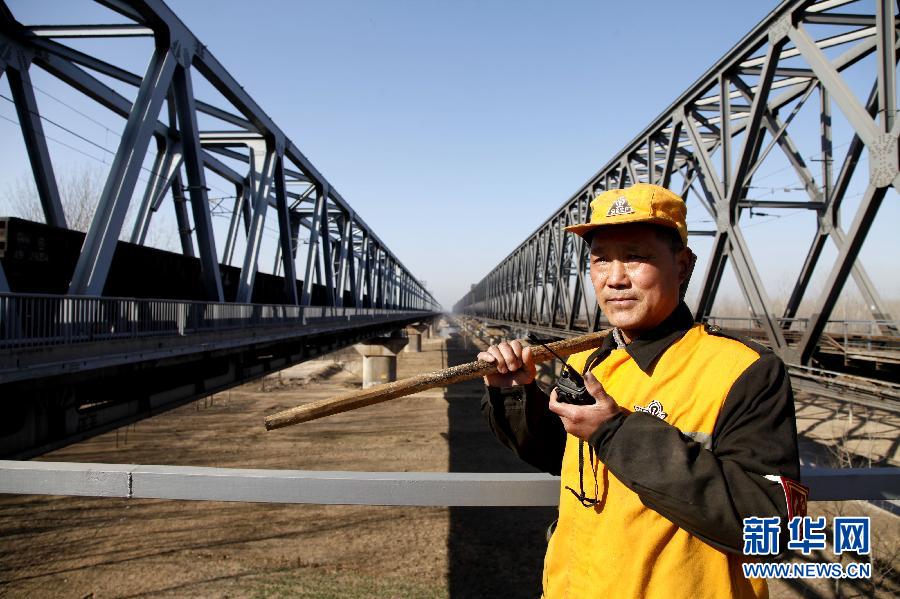 郑州铁路局新乡桥工段东明桥梁车间巡守工陈忠印在长东黄河特大桥上巡查(12月30日摄)。春节前夕,郑州铁路局新乡桥工段负责维护的千里铁道线上南来北往的运输压力陡然增大,每隔几分钟便有一列满载旅客或货物的列车呼啸而过……在这条中原铁路大动脉上,正是有成百上千的铁路职工的默默奉献,才保障了运输线的顺畅通行。新华社记者 潘旭 摄