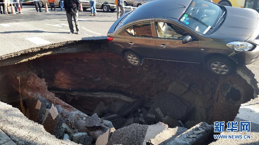 1月14日,一辆小轿车陷入坑边缘(手机拍摄)。当日上午,广州市科韵路上发生一处“地陷”,一辆小轿车陷在坑边缘。截至14日中午,该车已被拖出,事件未造成人员伤亡。 新华社记者 詹奕嘉摄