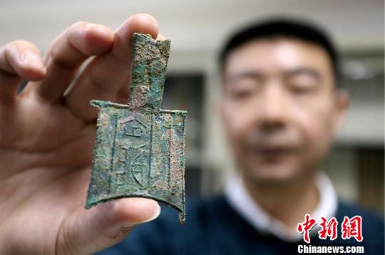 图为铁铲形状的先秦时期的平肩空首布“安藏”古钱币。杨正华 摄