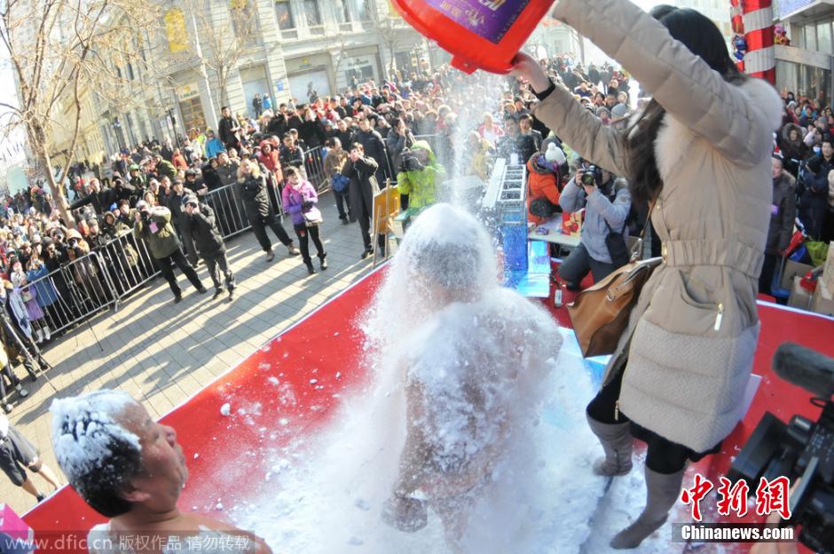 2015年1月17日,一名冬泳爱好者在挑战。当日,百分钟百桶雪,冰王挑战赛在哈尔滨中央大街举行。本次挑战赛擂主是世界耐冰吉尼斯记录保持着金松浩。挑战者是由10名哈尔滨市冬泳爱好者参与。挑战极限是在100分钟内向金松浩的头上倒100桶雪,其他挑战者为10桶。图片来源:东方IC 版权作品 请勿转载