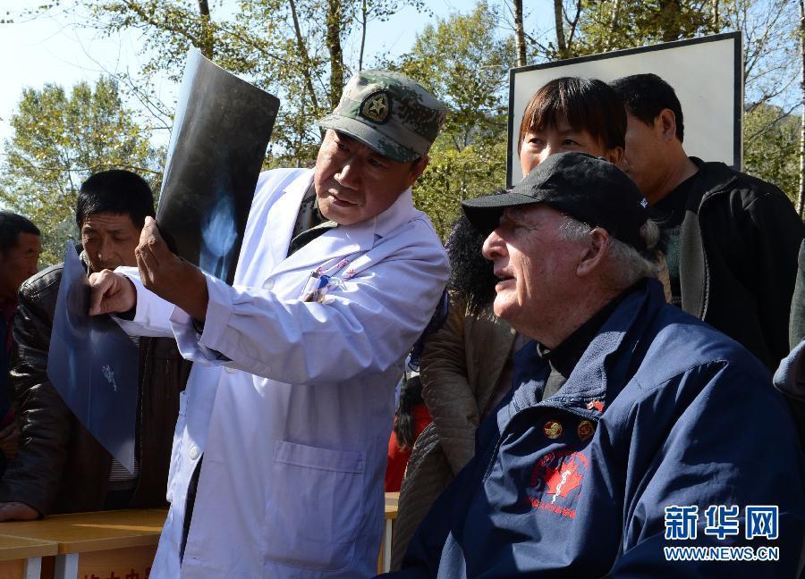 在河北涞源县银山口村,加拿大队员格兰特·斯图尔特医生(右)与白求恩国际和平医院“白求恩医疗队”的骨科步建立医生一起为村民义诊(2014年10月14日摄)。新华社发(刘会宾 摄)