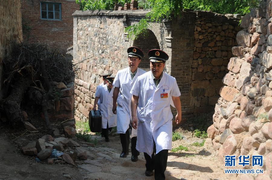 北京军区白求恩国际和平医院“白求恩医疗队”到太行老区组织重走白求恩路活动,医疗队队员走村串户,为行动不便的患者巡诊(2012年5月17日摄)。新华社发(卫枫 摄)