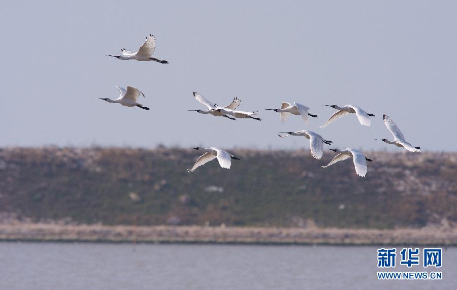 1月18日,一群黑脸琵鹭在福建兴化湾湿地上空飞翔。新华社记者 姜克红 摄