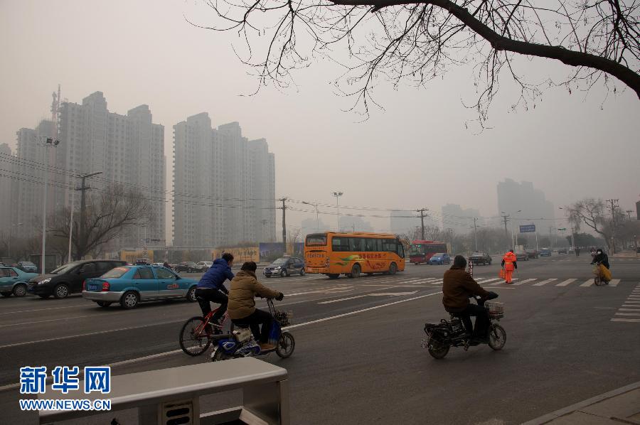 1月15日,河北邢台市民在雾霾笼罩的街道上骑行。当日,中央气象台继续发布霾黄色预警,15日白天到夜间,东北地区中部、北京中南部、天津大部、河北中南部、山西南部、河南北部、陕西关中、四川盆地等地仍有中度霾。预计1月16日起,上述地区的雾霾将自北向南减弱消散。新华社发(陈伟 摄)