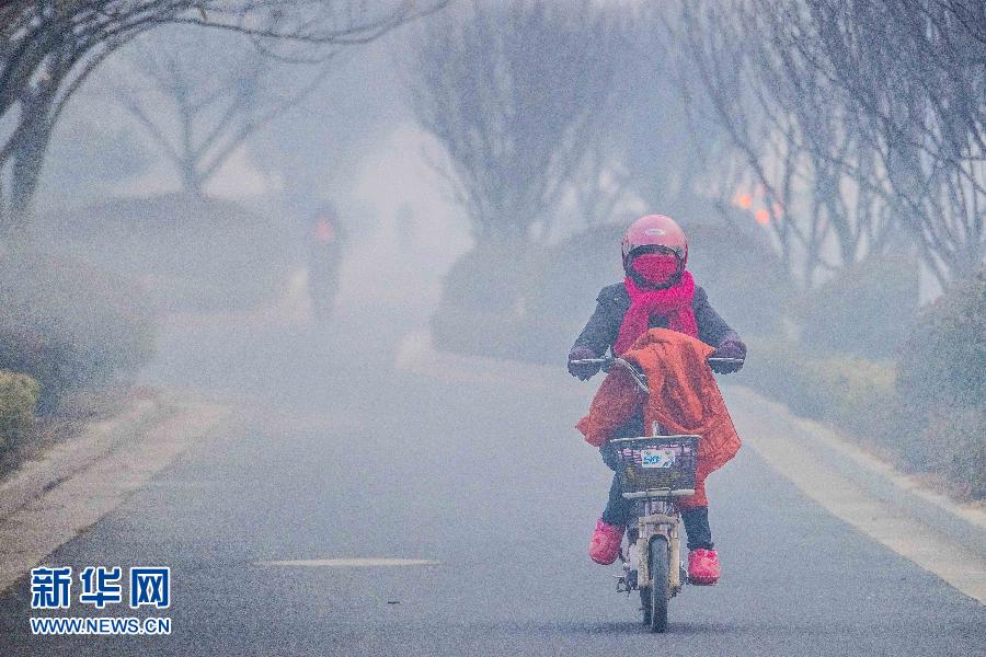 1月15日,在江苏省连云港市赣榆区,一名市民在雾霾中骑行。当日,中央气象台继续发布霾黄色预警,15日白天到夜间,东北地区中部、北京中南部、天津大部、河北中南部、山西南部、河南北部、陕西关中、四川盆地等地仍有中度霾。预计1月16日起,上述地区的雾霾将自北向南减弱消散。新华社发(司伟 摄)