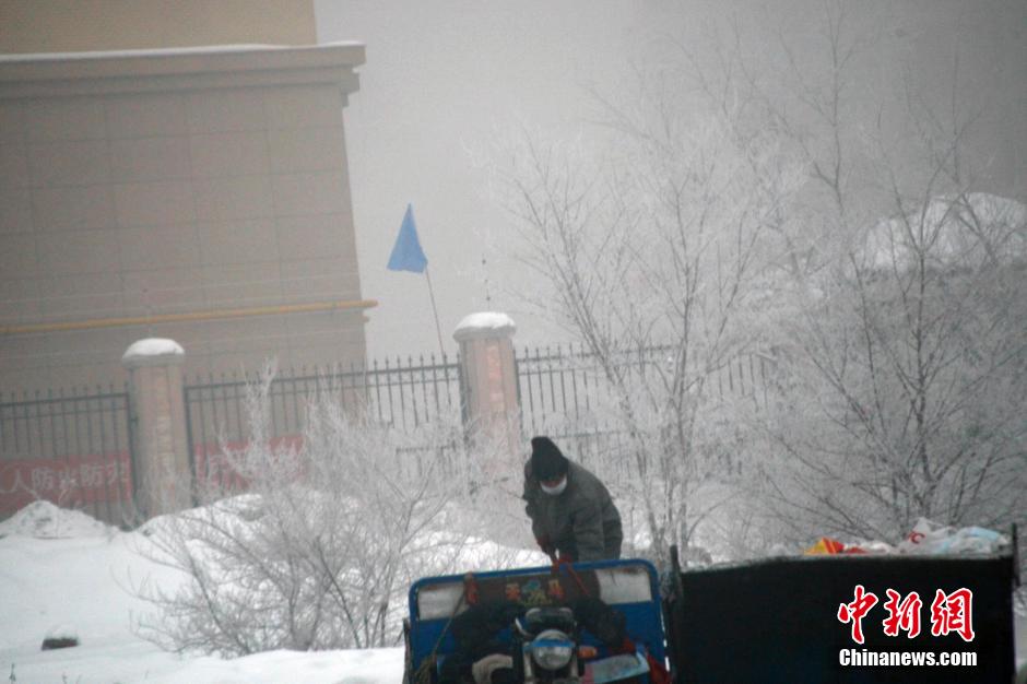 1月18日,乌鲁木齐出现大雾天气,城北雾气较重,大雾天气致乌鲁木齐周边多条公路通行受影响,乌奎高速公路,昌吉立交桥至玛纳斯收费站,因大雾能见度低,不具备通行条件,双向交通管制。图为生活垃圾清理人员在大雾中作业。中新社发 王小军 摄