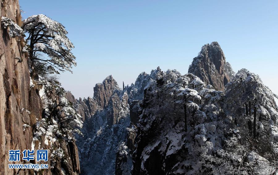 1月15日在黄山风景区拍摄的雪后壮美风景。当日,黄山风景区雪后初晴,景区内一派银装素裹,云海飘荡,分外妖娆。 新华社发(施广德 摄)