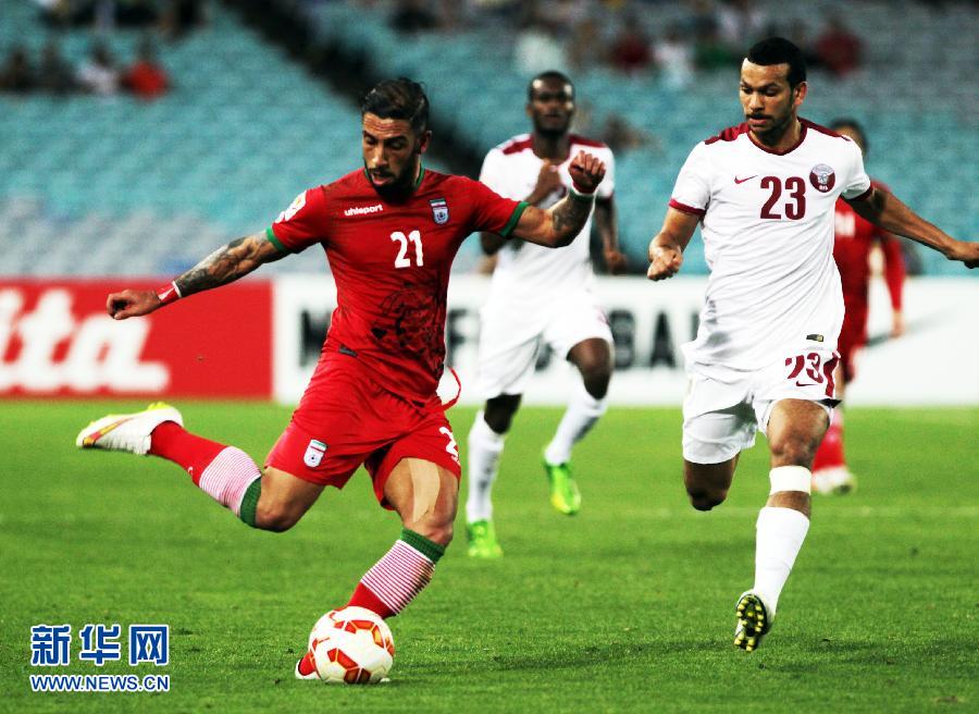 1月15日,伊朗队球员阿·德贾加(左)在比赛中。当日,在澳大利亚悉尼举行的亚洲杯足球赛C组比赛中,伊朗队以1比0战胜卡塔尔队。 新华社记者金林鹏摄