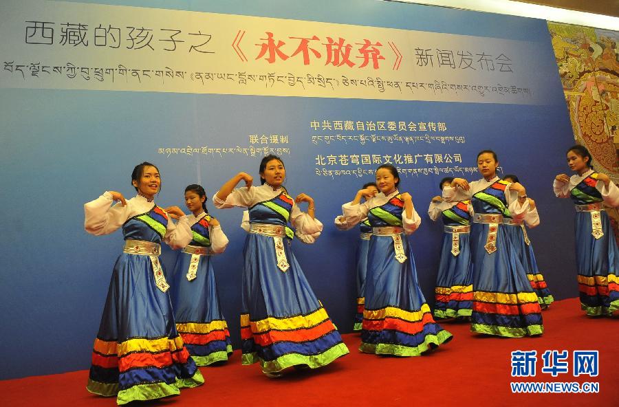 1月18日,在北京西藏中学求学的藏族学生在新闻发布会现场表演藏族歌舞。当日,公益电影西藏的孩子之《永不放弃》在北京举行新闻发布会,宣布该片已完成剧本创作,进入角色遴选阶段。影片《永不放弃》根据藏族青年作家鹰萨·罗布次仁创作的小说《西藏的孩子》改编而成,讲述西藏孩子在内地求学成长的故事,展现了雪域高原浓郁的风土人情及西藏与时俱进的发展变化。新华社记者 鲁鹏 摄