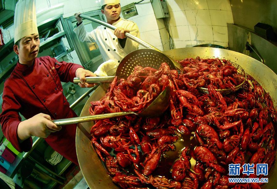 1月19日,江苏省盱眙县一家龙虾店的厨师在烹制小龙虾。地处淮河下游、洪泽湖南岸的江苏省淮安市盱眙县是我国著名的“龙虾之乡”。进入冬季,当地将盛夏时节采取低温“冬眠”保鲜储存的500吨龙虾陆续投放市场。小龙虾经中药材等调料烹煮后,味道鲜美,辛辣可口,成为当地独具风味的美食。新华社发(周海军 摄)