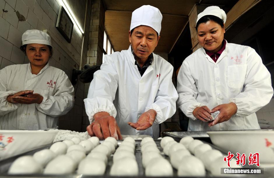 在武汉汉口有一家不得不去的餐馆——五芳斋酒楼。年过花甲的张永利,在五芳斋干了40年。2003年五芳斋酒楼完成股份制改革,更名为武汉五芳斋食品贸易有限公司。从此,这家餐馆开始向食品加工生产企业转型。从五六十店员人工搓汤圆,一天生产80箱,到机器一天生产500箱。五芳斋汤圆走进江城武汉各大超市开设专柜,直接与龙凤等外地品牌竞争,也满足了武汉市民在家门口吃到五芳斋汤圆的愿望。图为搓汤圆也有技巧,不然一煮就开花。 张畅 摄