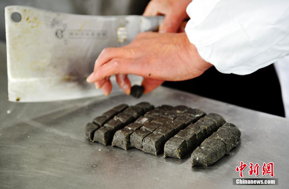 图为芝麻馅芯就是这样分切出来的。 张畅 摄