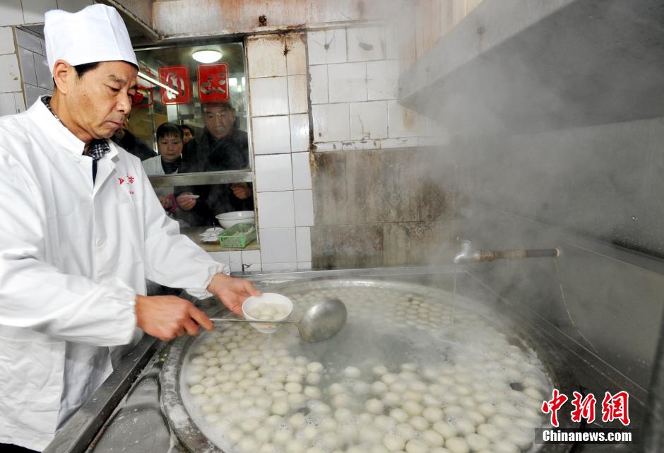 图为大锅煮汤圆也有火候讲究,张永利在为顾客盛汤圆。 张畅 摄