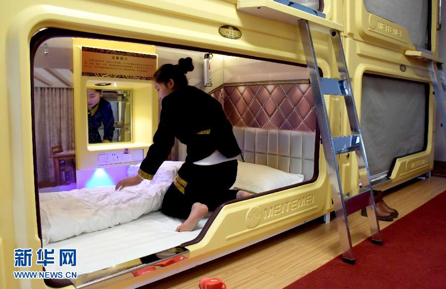 1月15日,工作人员在舱房内整理床铺。近日,起源于日本的“胶囊”旅馆在河南郑州悄然兴起。床铺、网络电视、无线网络,两平方米左右的舱房内一应俱全,前来住宿的客人以学生、旅行者及求职的年轻人居多。新华社记者 李安摄